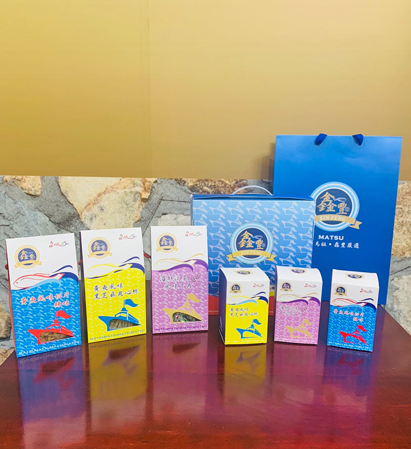 鑫豐來自馬祖使用,新鮮海產,研發出夾心絲、切片、丁角等零嘴將馬祖的海味讓更多消費者品嘗。