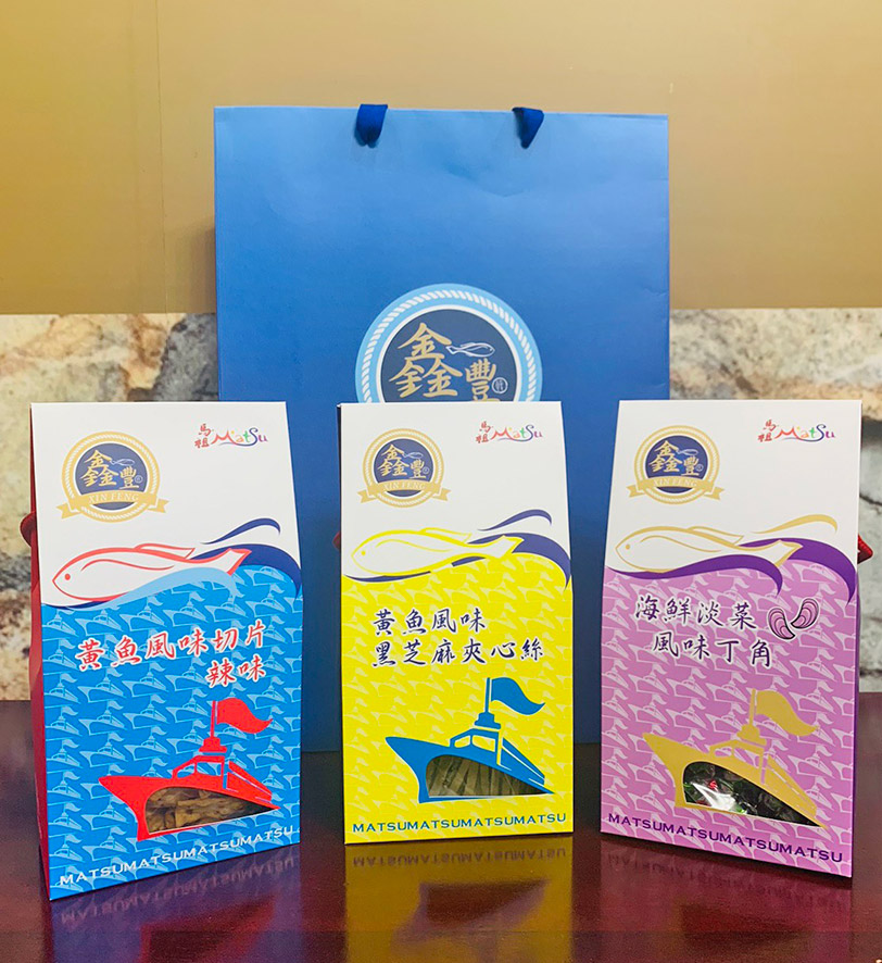 鑫豐來自馬祖使用,新鮮海產,研發出夾心絲、切片、丁角等零嘴將馬祖的海味讓更多消費者品嘗。